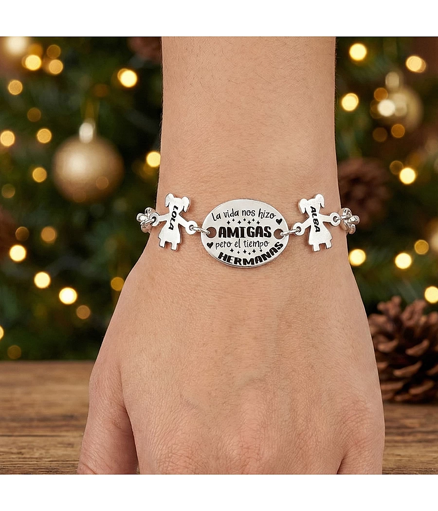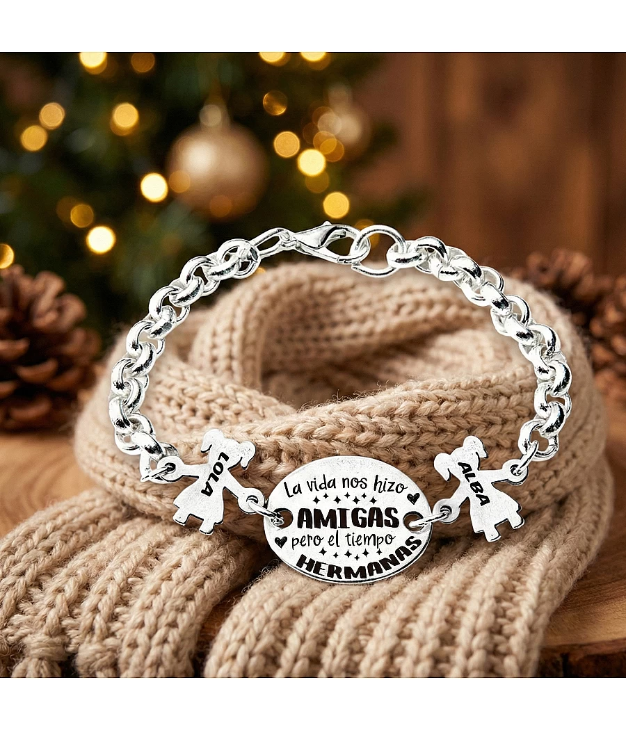 En 40 Grados a la Sombra fabricamos esta pulsera personalizada para mujer con cadena rolo de 12mm y piezas de zamak con baño en plata con una medalla ovalada central con el texto La vida nos hizo Amigas, pero el tiempo Hermanas y dos muñequitas con los nombres. Puedes añadir hasta 7.