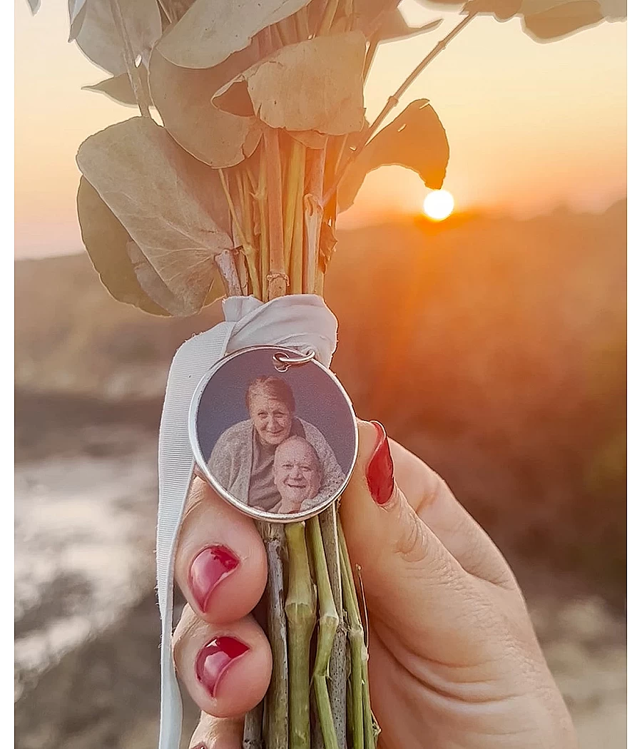 Añade un toque único y emotivo a tu ramo de novia con este lazo personalizado con medalla y foto barnizada UV. Un detalle inolvidable para un día irrepetible.