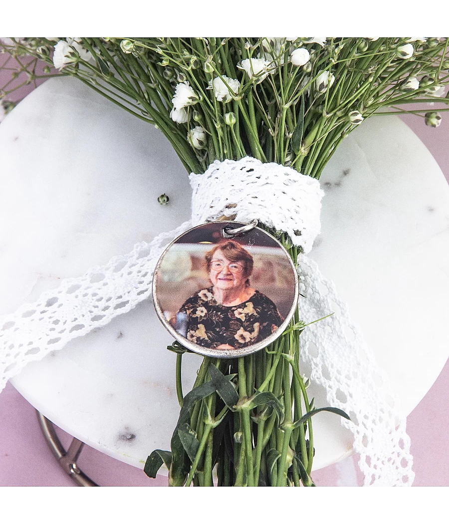 Añade un toque único y emotivo a tu ramo de novia con este lazo personalizado con medalla y foto barnizada UV. Un detalle inolvidable para un día irrepetible.
