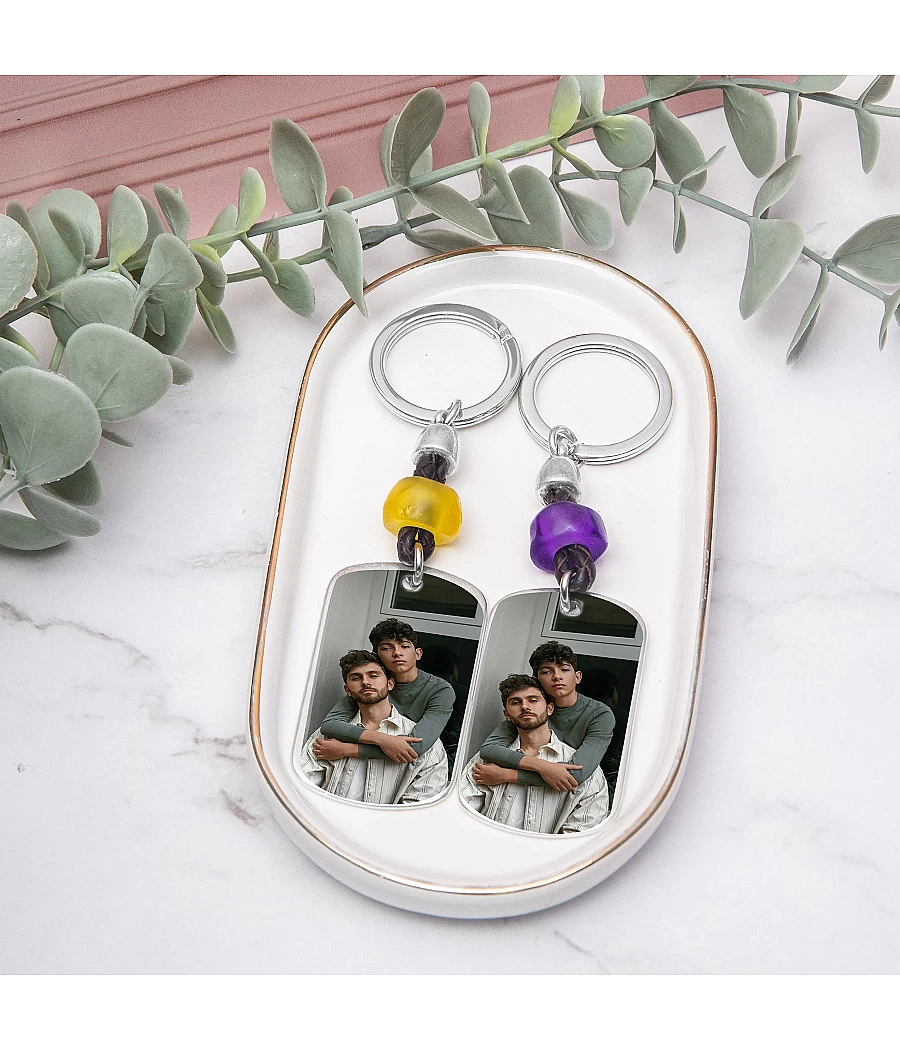 Kit de llaveros de cuero nacional trenzado con resina de color y chapa rectangular de 45mmx25mm con baño en plata de 15 micras con foto.