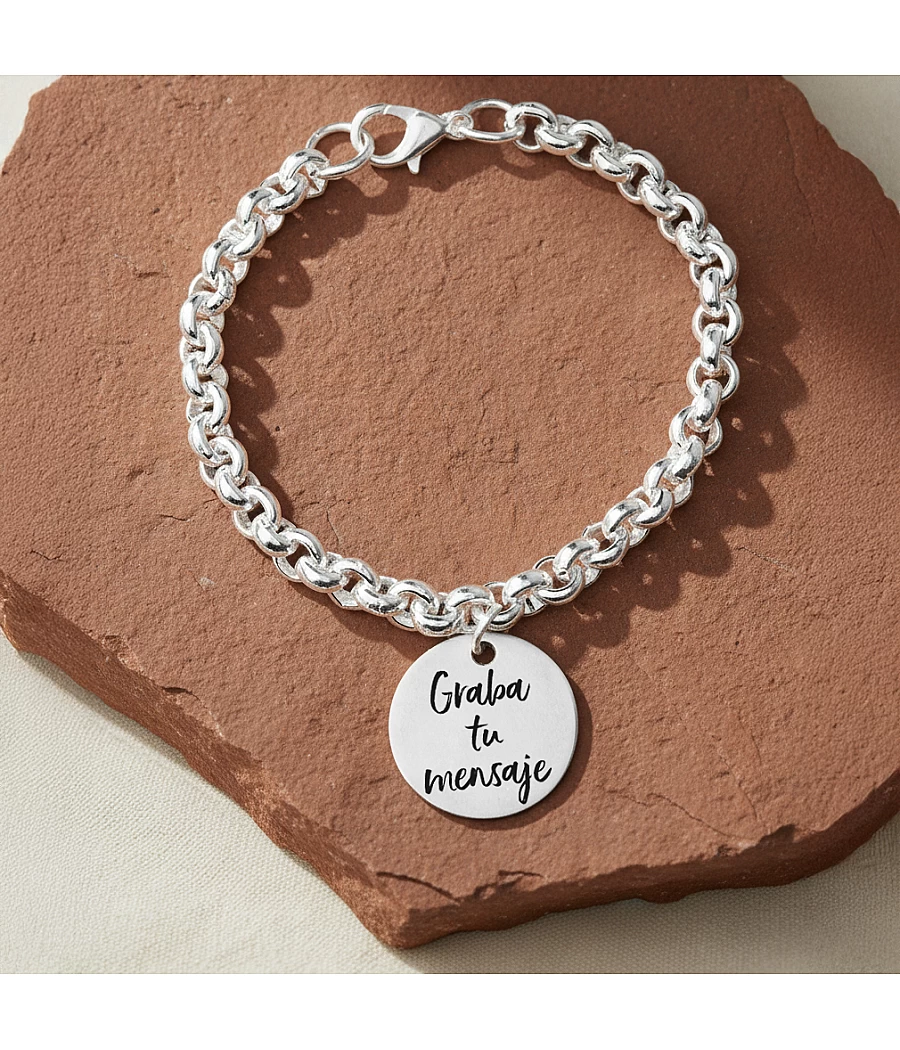 Una pulsera no es solo un complemento, es una forma de decir lo que sientes sin palabras. Esta pulsera personalizable de cadena rolo, fabricada en zamak con baño de plata, es perfecta para grabar nombres, fechas o frases que te representen.