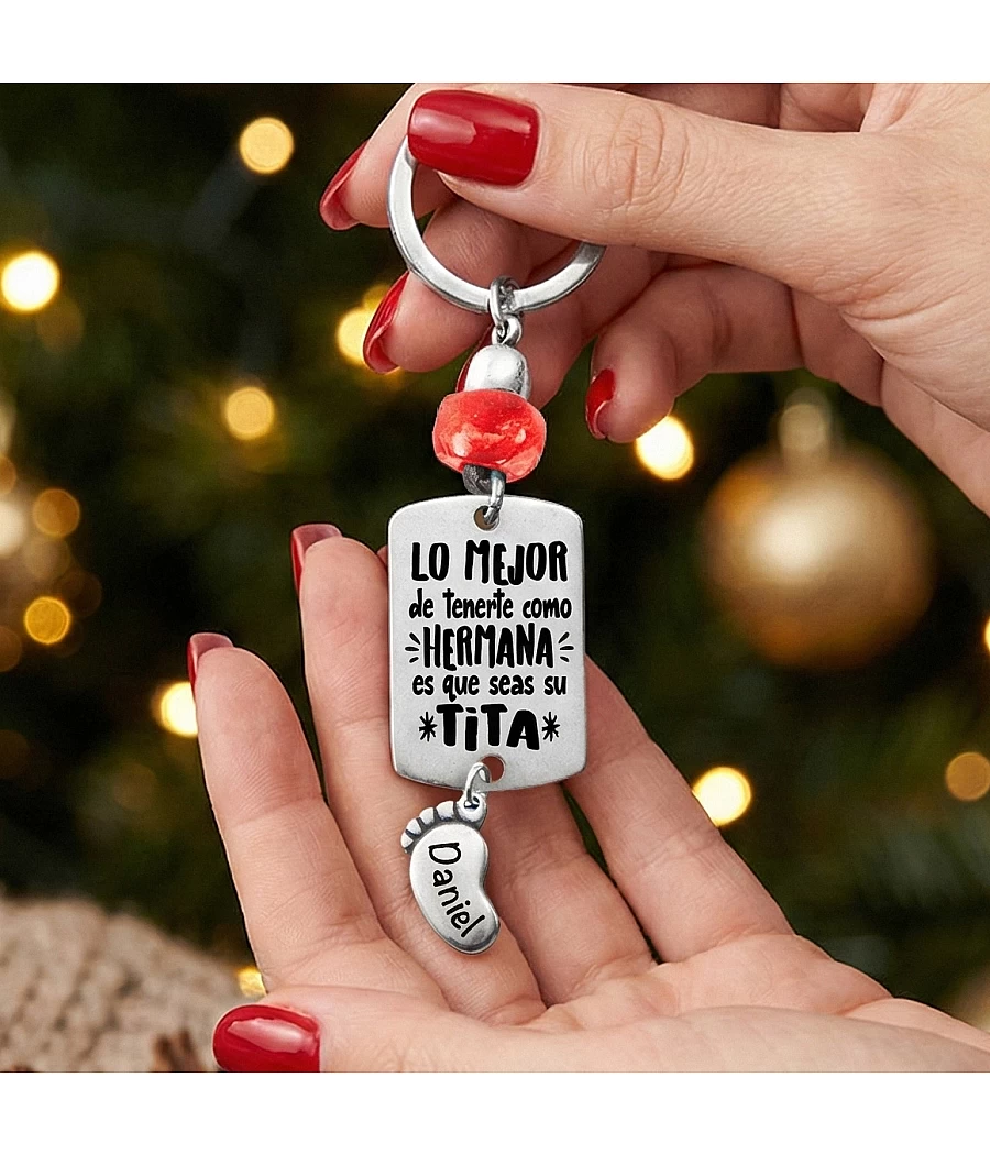Llavero de cuero trenzado nacional y resina con chapa con la inscripción Lo mejor de tenerte como HERMANA es que seas su TITA, y 1 pie grabado.