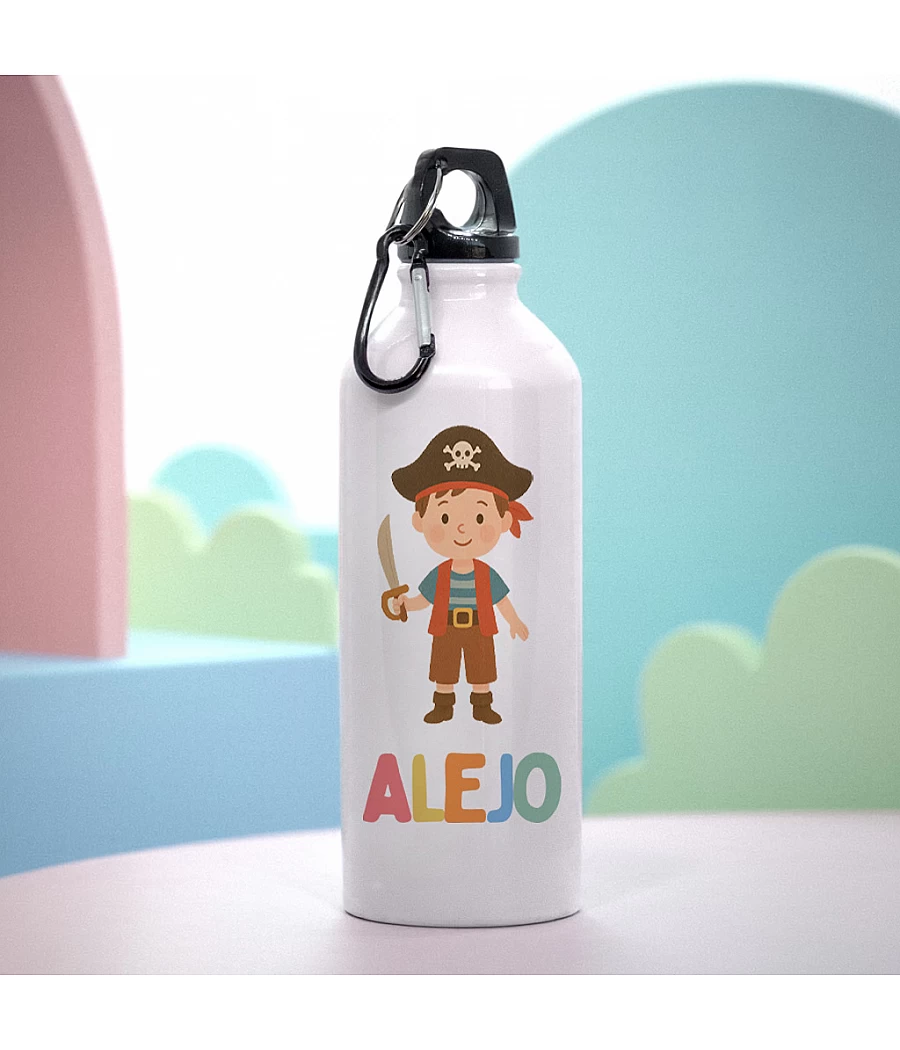 Esta botella de aluminio blanca de 600 ml es el accesorio perfecto para acompañar a los peques en el colegio, la guardería o durante sus actividades favoritas. Con su dibujo de Pirata y su nombre personalizado, se convierte en una opción bonita y práctica que les encantará llevar siempre consigo.