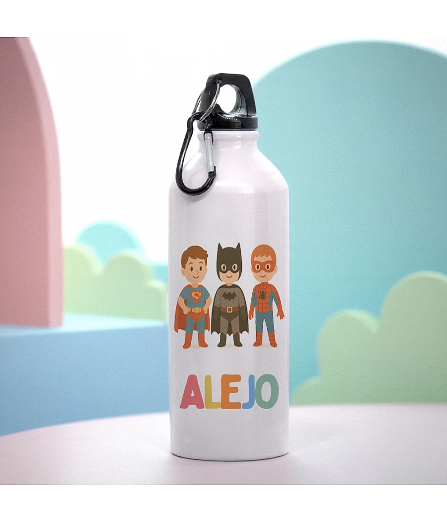 Botella infantil personalizada de aluminio blanco con nombre y diseño de superheroes. Capacidad de 600 ml, tapón de rosca seguro y resistente. Ideal para el cole, actividades extraescolares o excursiones. Un accesorio práctico, bonito y único para el día a día.