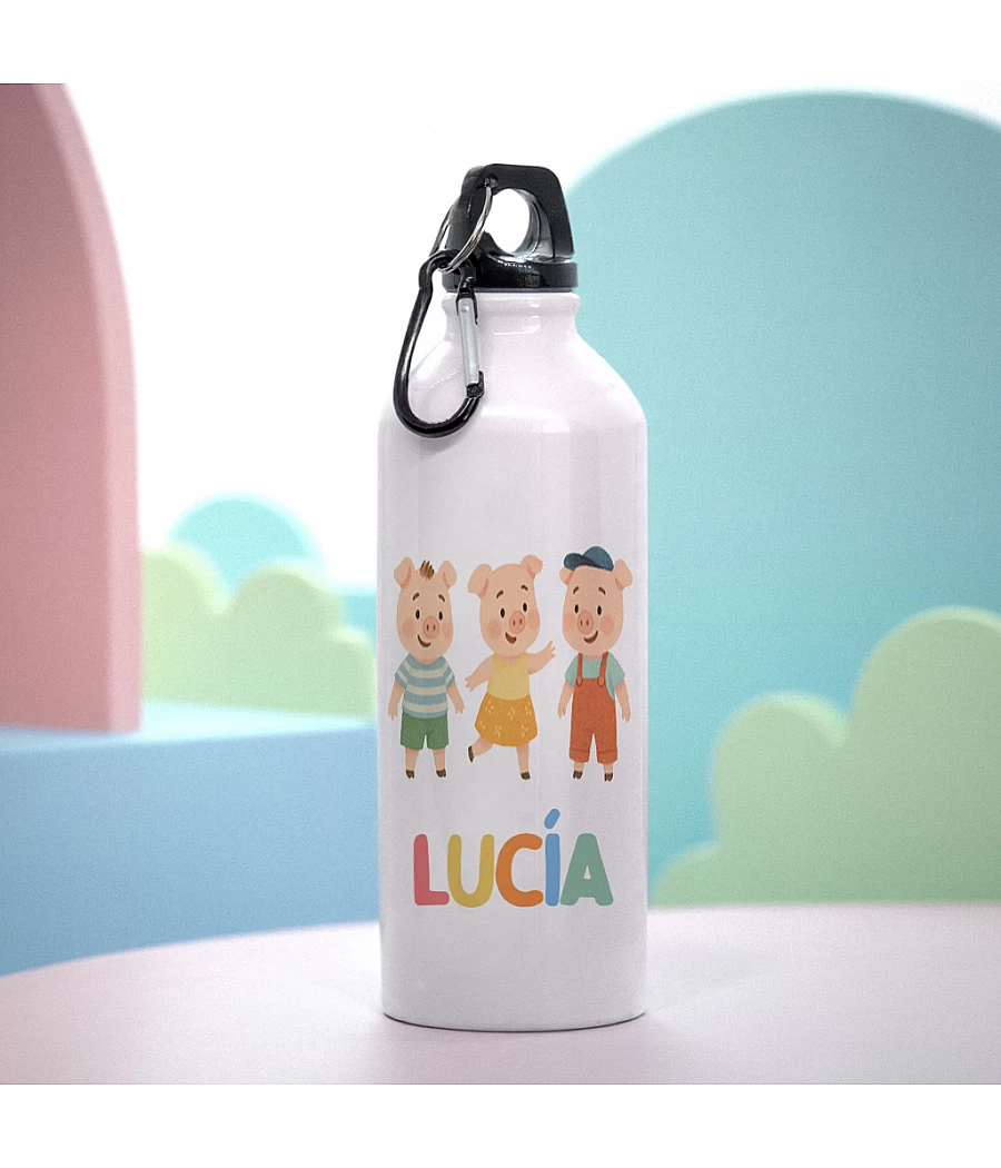 Botella infantil personalizada de aluminio blanco con nombre y diseño de los Tres Cerditos. Capacidad de 600 ml, tapón de rosca seguro y resistente. Ideal para el cole, actividades extraescolares o excursiones. Un accesorio práctico, bonito y único para el día a día.