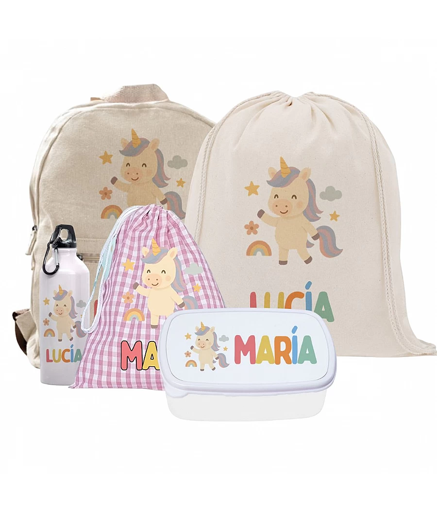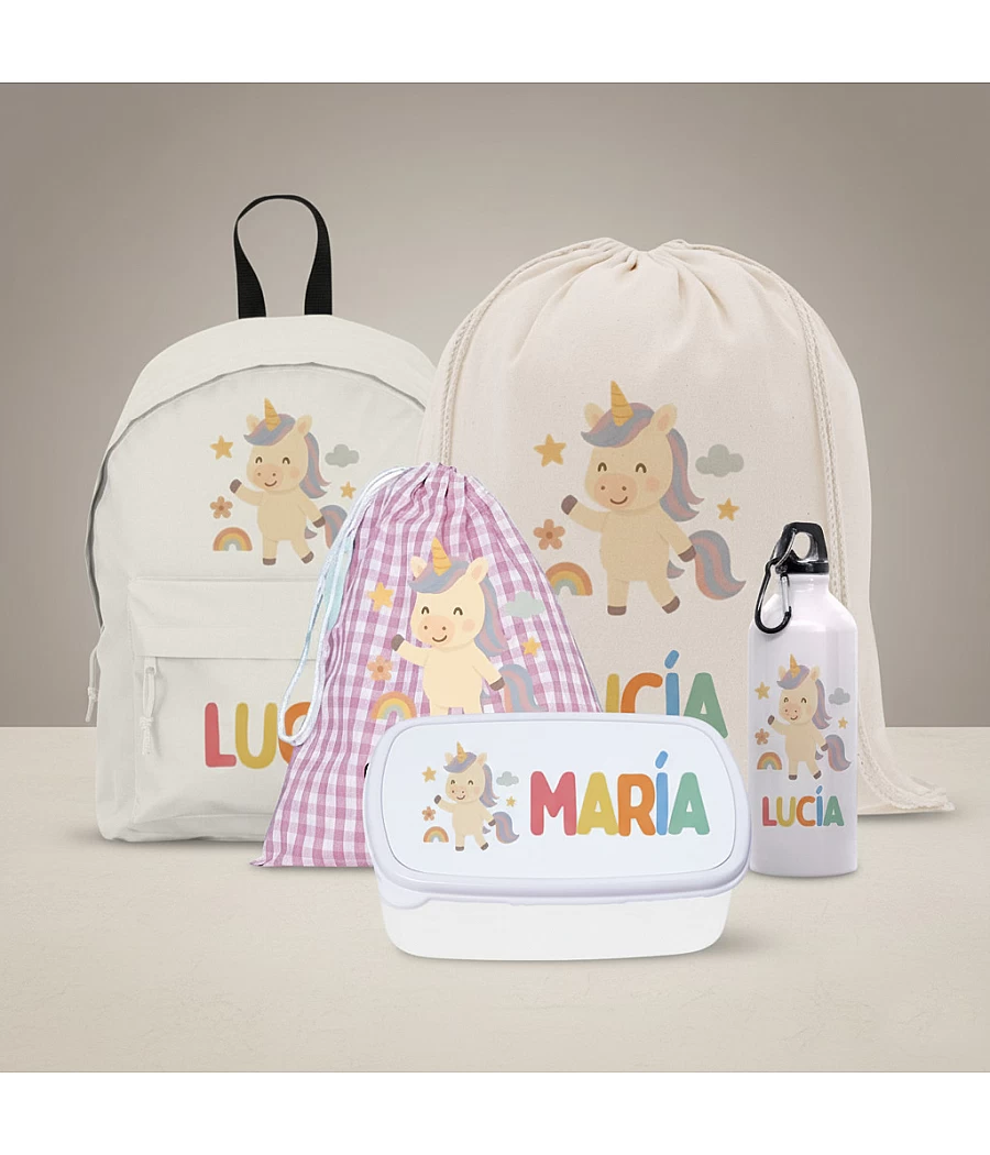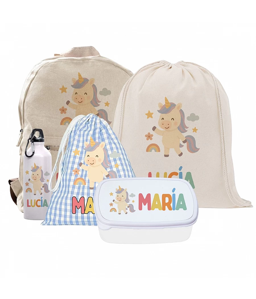 Con este PACK ESPECIAL de Unicornio, tu peque empezará el cole más preparado/a que nunca y con todo personalizado para no mezclar sus cosas con las de nadie. Un set completo, bonito y útil, ¡ideal para regalar o estrenar curso! Incluye mochila, gymbag, fiambrera, botella y bolsa extra, todo personalizado y disponible en azul o rosa.