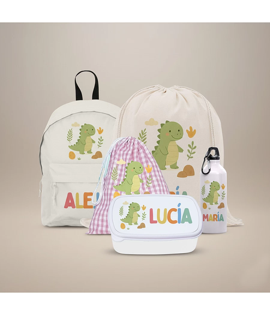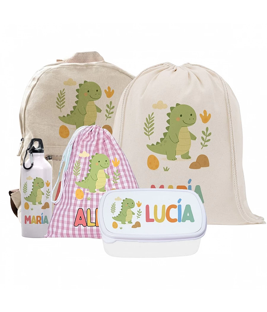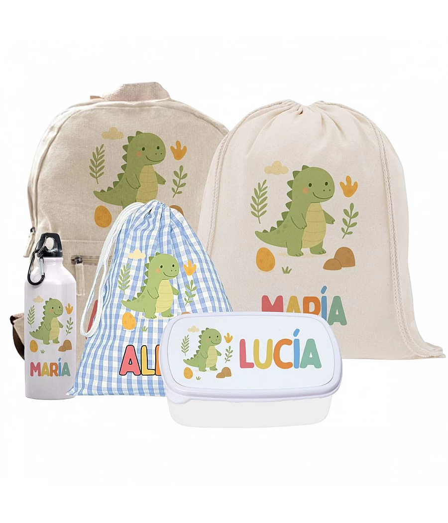 Con este PACK ESPECIAL de Dinosaurio, tu peque empezará el cole más preparado/a que nunca y con todo personalizado para no mezclar sus cosas con las de nadie. Un set completo, bonito y útil, ideal para regalar o estrenar curso! Incluye mochila, gymbag, fiambrera, botella y bolsa extra, todo personalizado y disponible en azul o rosa.