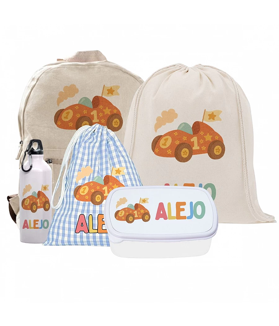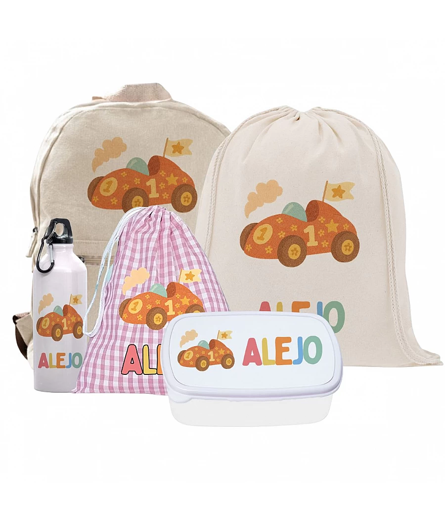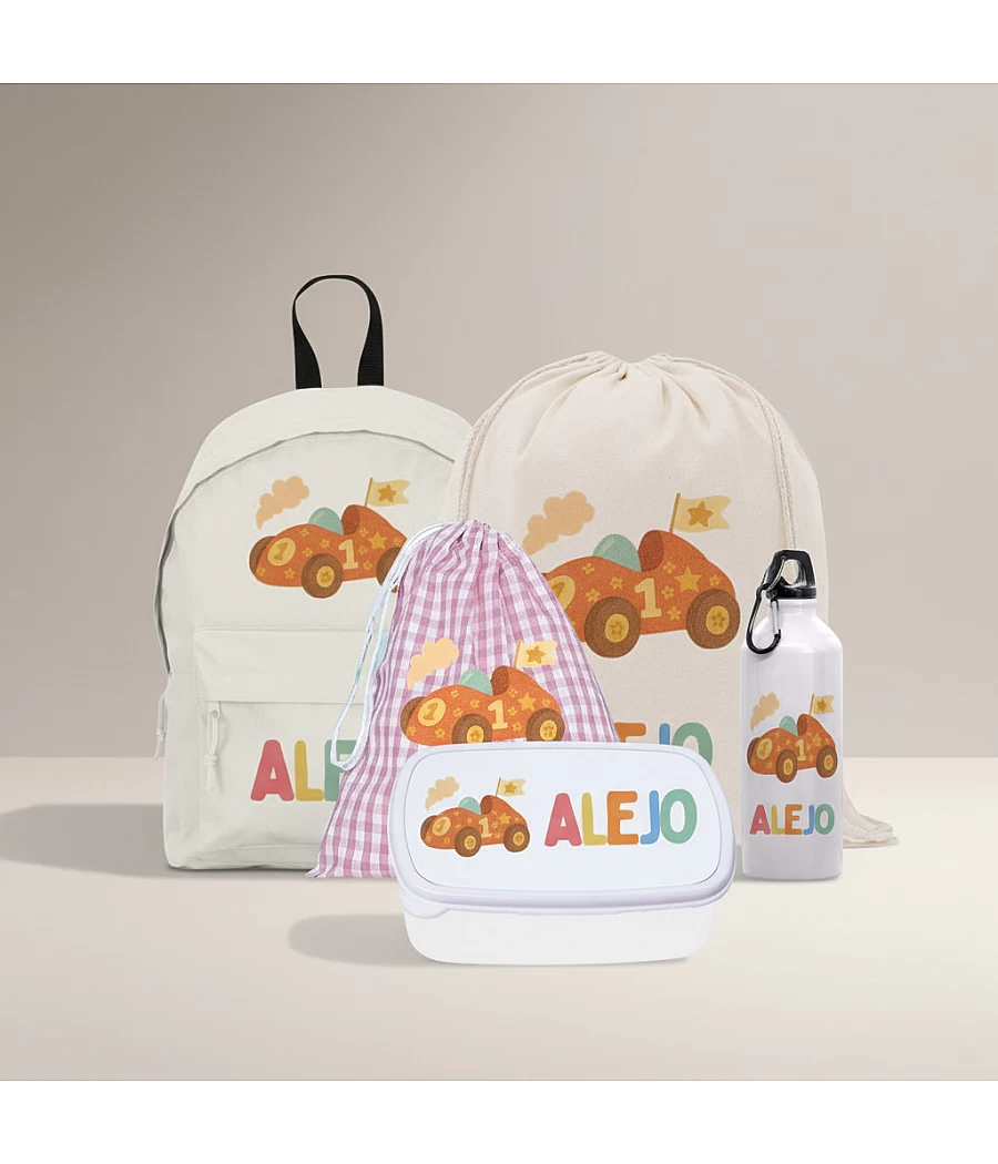Con este PACK ESPECIAL de Coche, tu peque empezará el cole más preparado/a que nunca y con todo personalizado para no mezclar sus cosas con las de nadie. Un set completo, bonito y útil, ¡deal para regalar o estrenar curso! Incluye mochila, gymbag, fiambrera, botella y bolsa extra, todo personalizado y disponible en azul o rosa.