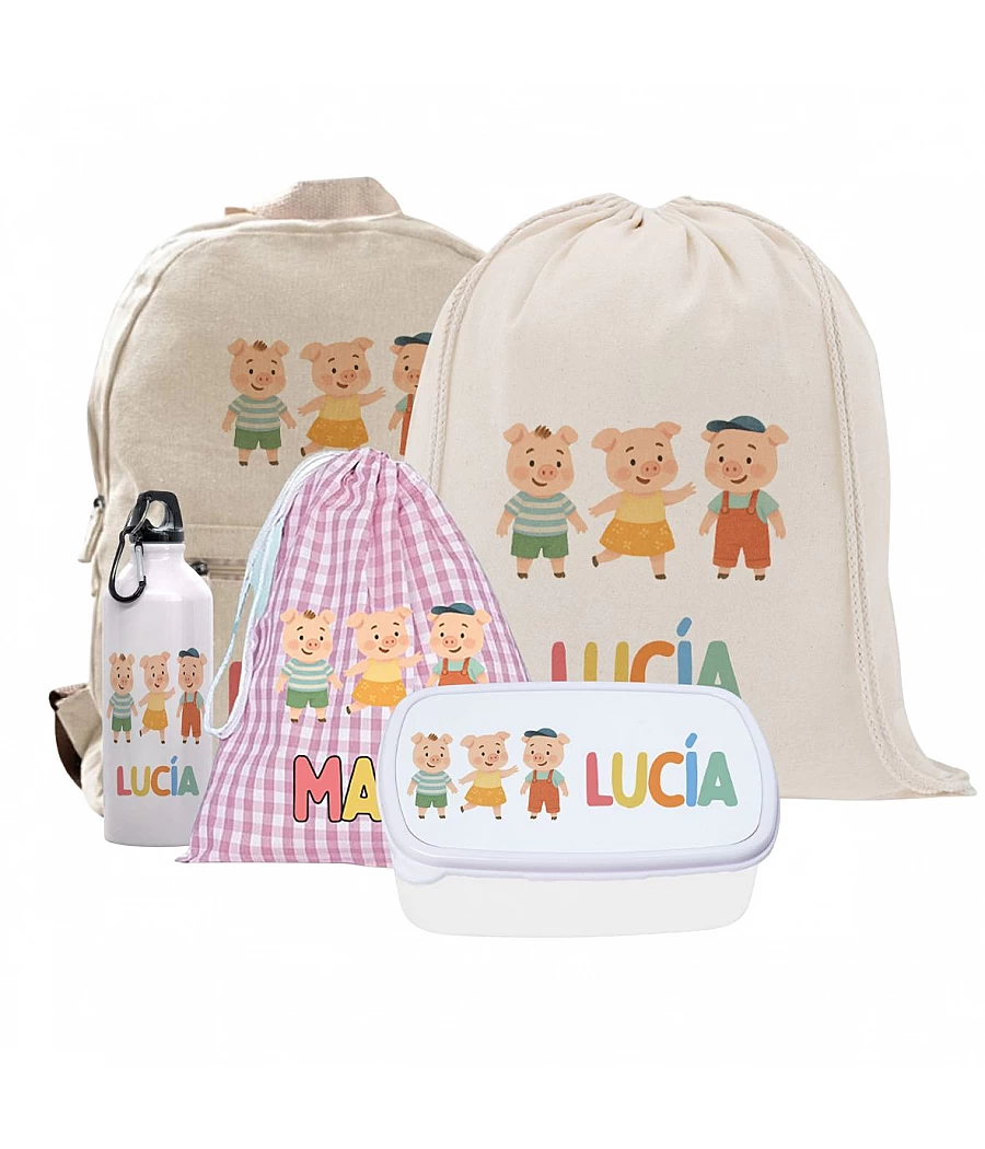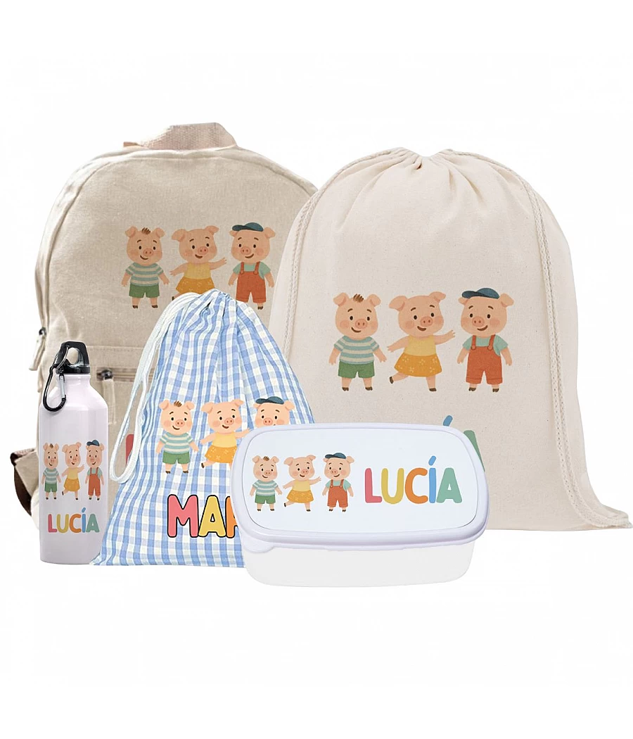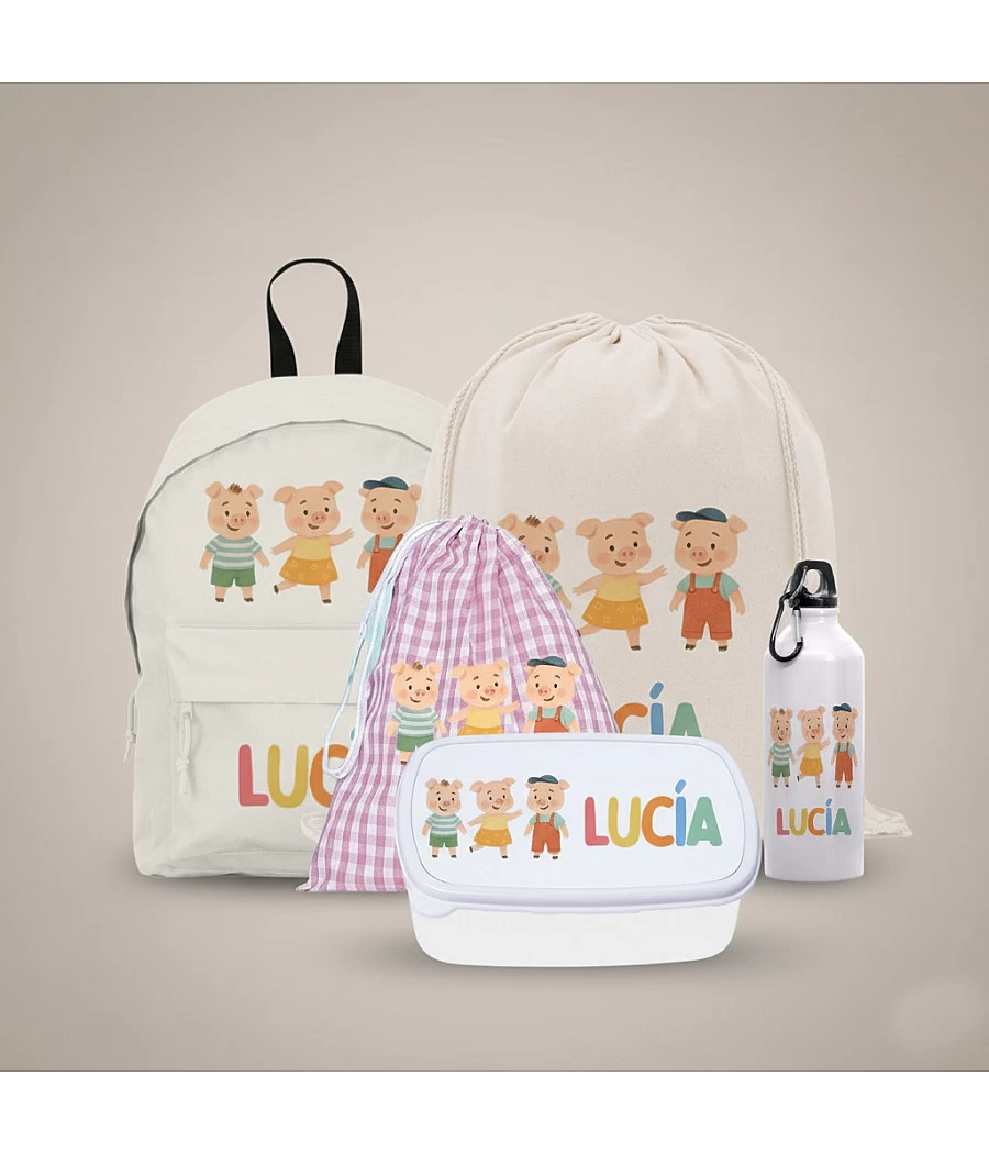 Con este PACK ESPECIAL de Tres Cerditos, tu peque empezará el cole más preparado/a que nunca y con todo personalizado para no mezclar sus cosas con las de nadie. Un set completo, bonito y útil, ¡deal para regalar o estrenar curso! Incluye mochila, gymbag, fiambrera, botella y bolsa extra, todo personalizado y disponible en azul o rosa.